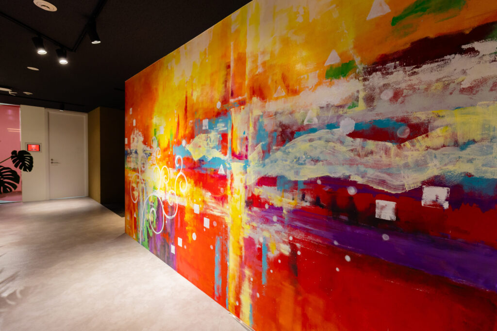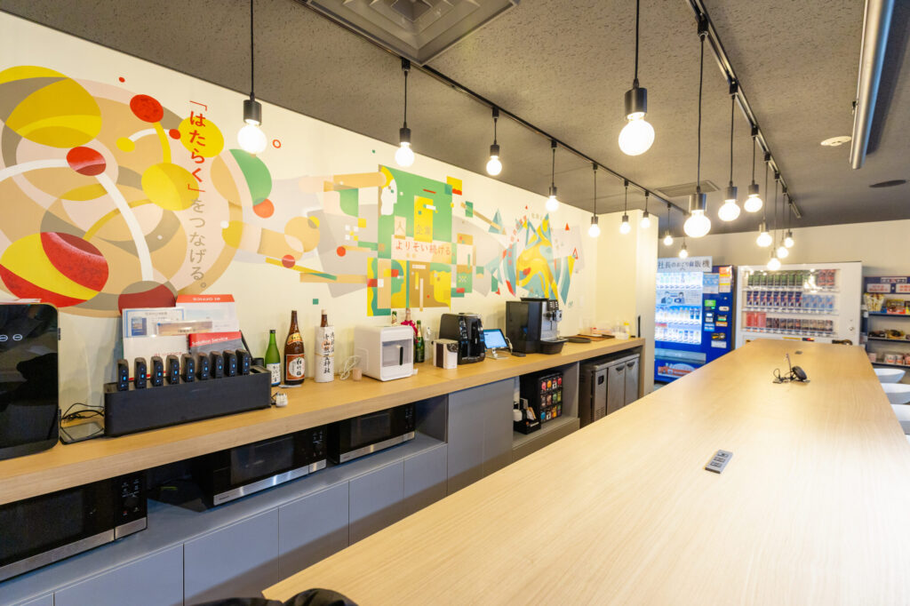 特にこだわったのが、壁一面に描いた大きなアートです。ここには弊社の「ミッション・ビジョン・バリュー」や中長期ビジョンを落とし込んでいます。堅苦しい文字だけの掲示ではなく、アートとして表現することで、社員が自然と理念を意識できる環境を作りました。お客様をお迎えした際にも、このアートが会話のきっかけとなり、弊社の姿勢や想いを等身大の言葉で語るための大切な架け橋になればとの思いで設置しました。
