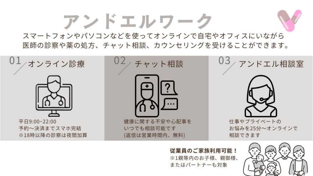 今、アットオフィスらしくこだわって導入できたと感じるのは、「アンドエルワーク」です。こちらは別部署が行っている起業家インタビューが発端となっており、スマホで簡単にできるオンライン診療サービスです。様々なタイムパフォーマンス向上とリスクヘッジを兼ね備えた素晴らしいものとなっており、進めない理由がありませんでした。繋がりによって施策が実現できたことは、関わった全ての従業員の想いもプラスされ大事にされる施策になると思っております。